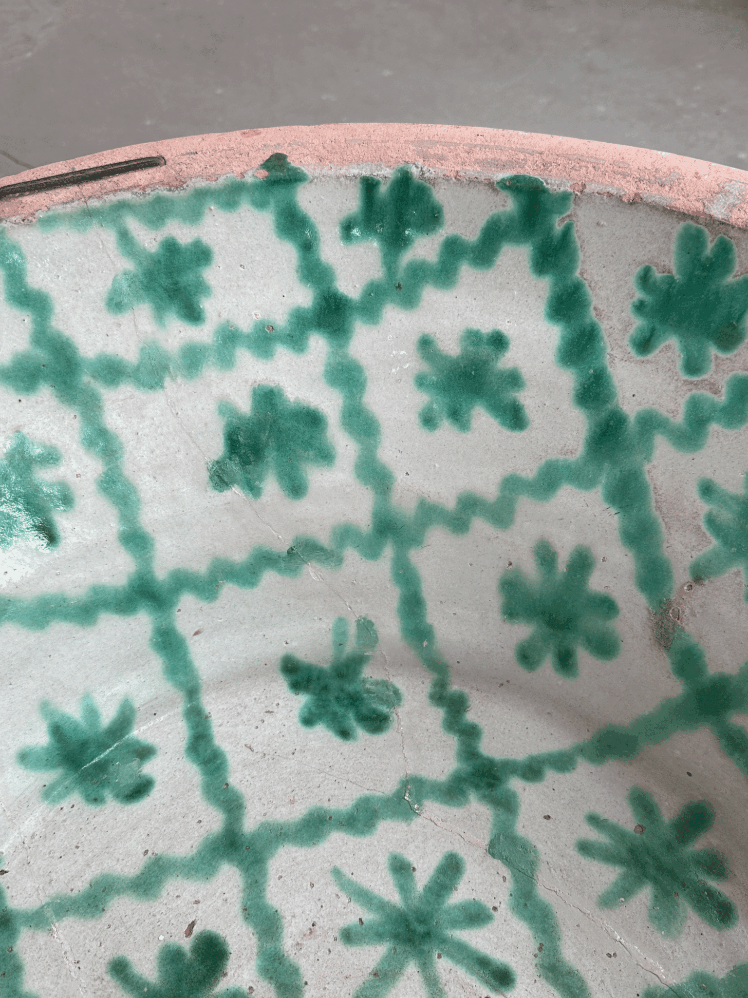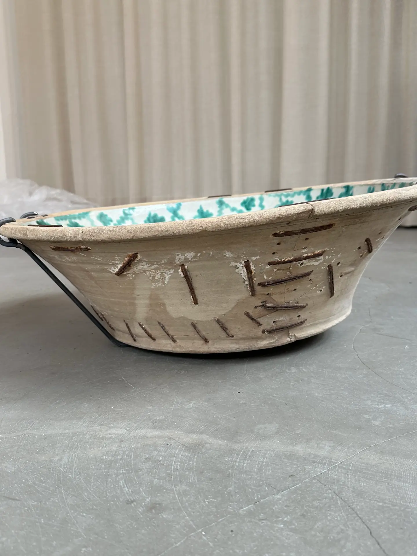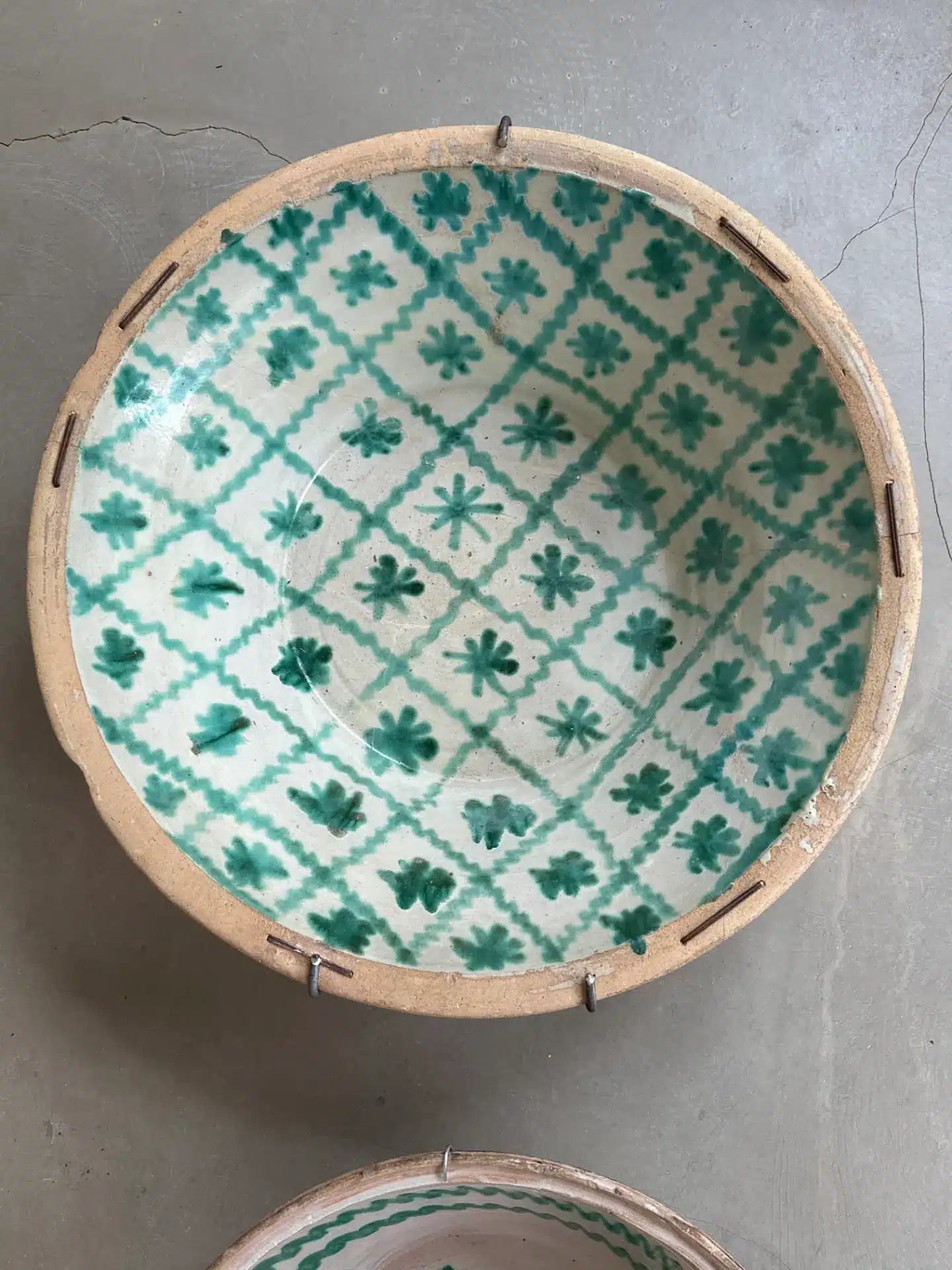 Denne særlige lebrillo stammer fra Granada i Spanien. Den har de typiske grønne og hvide farver og er dekoreret med et helt unikt mønster. Det grafiske mønster findes stort set ikke på denne type fade, som oftest er dekoreret med granadablomster og bølgende streger. Fadet er forstærket på traditionel vis med store stålklamper langs kanten og fremstår holdbart og i rigtig smuk vintagestand.