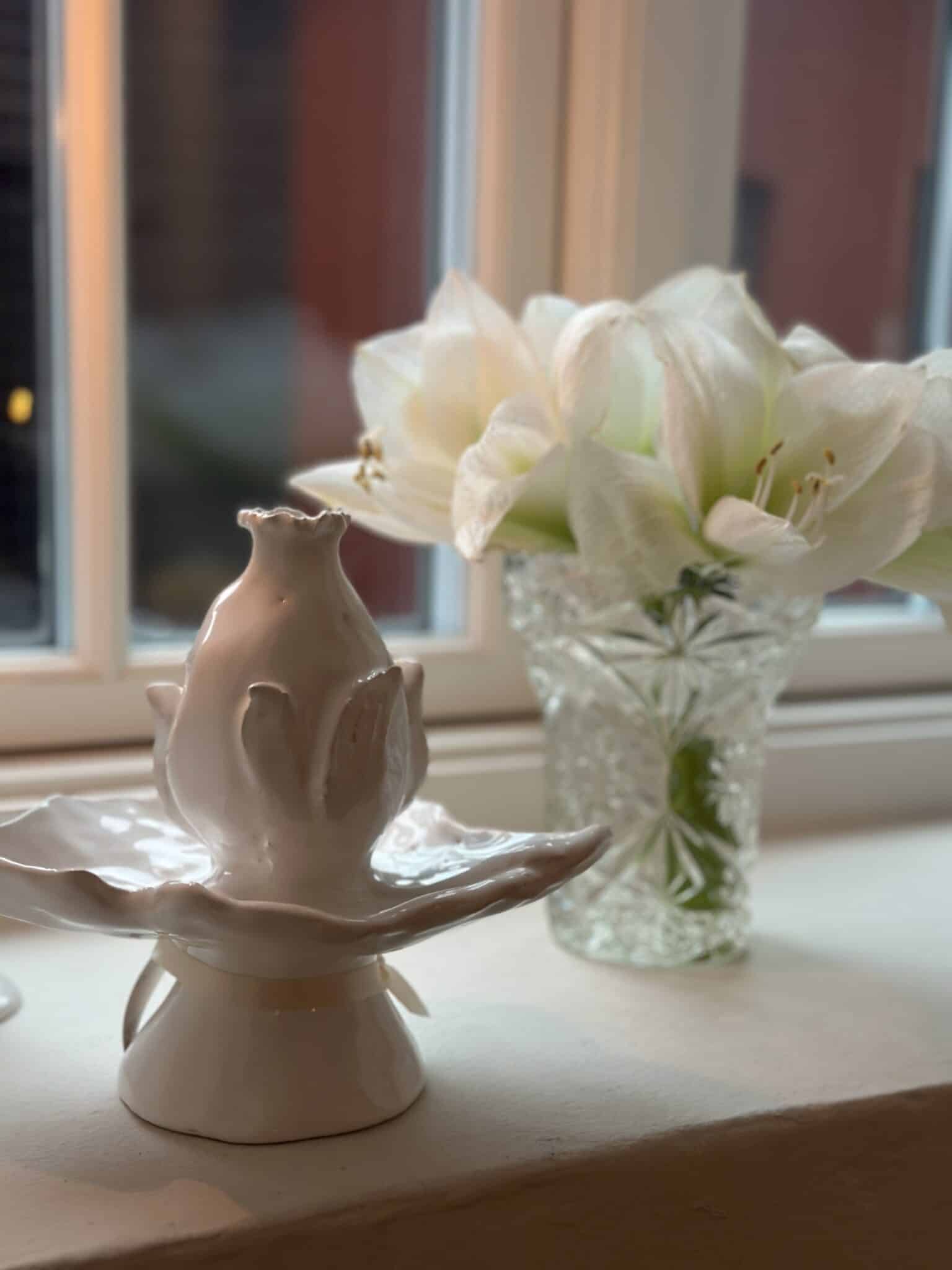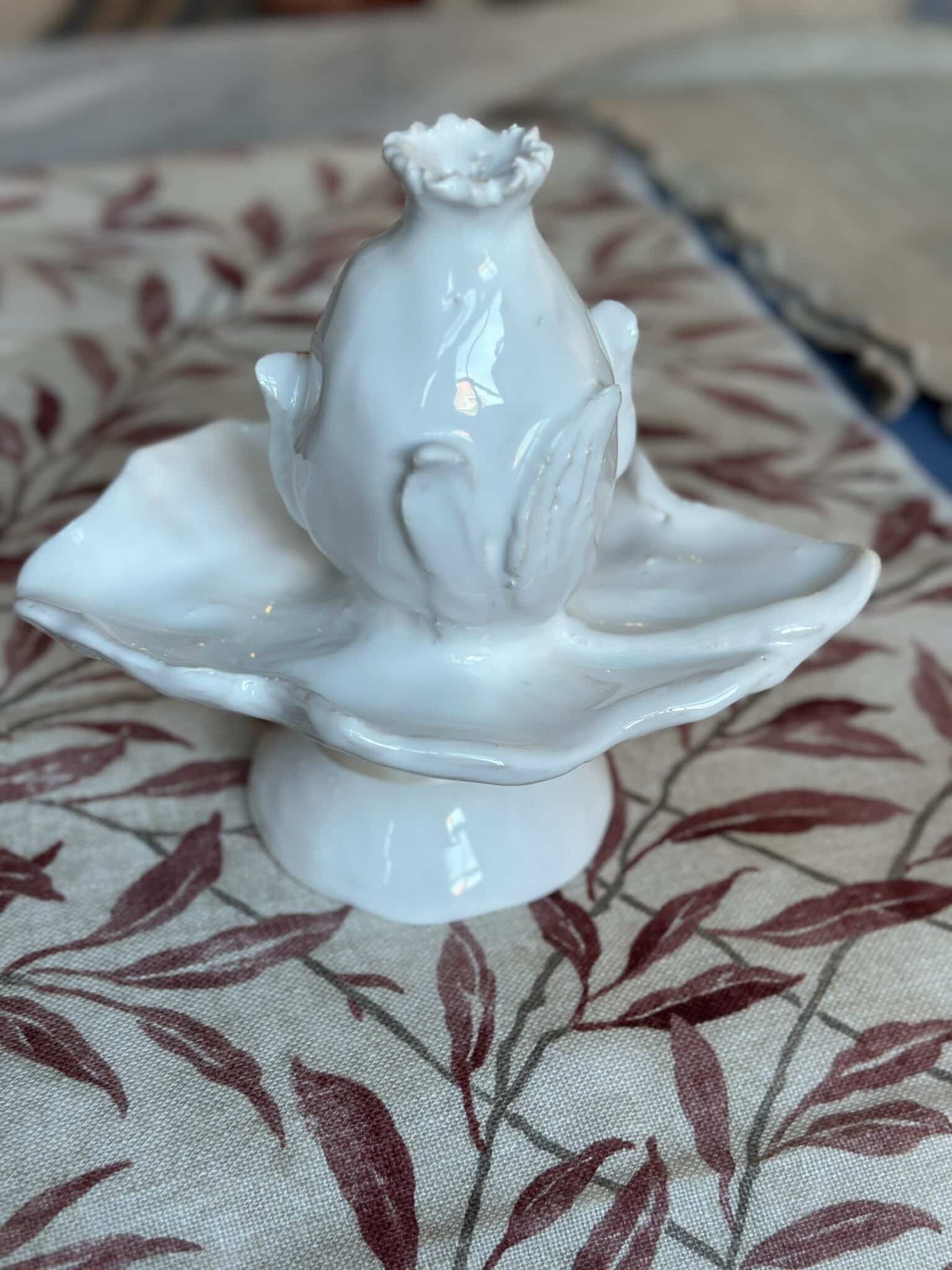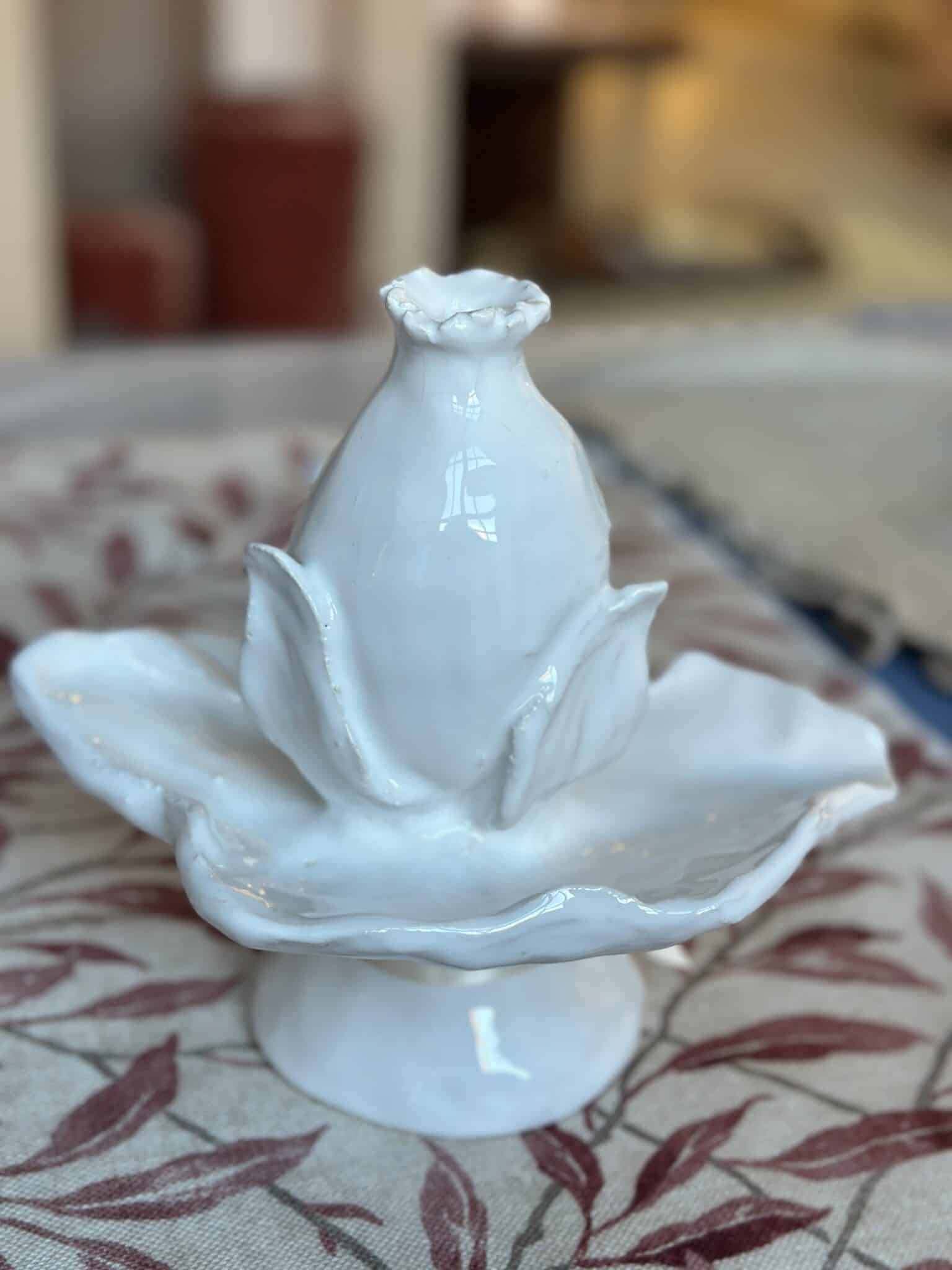 Smuk skulptur med en forstørret valmue-frøstand på toppen. Keramik med lækker, tyk kridhvid glasur.